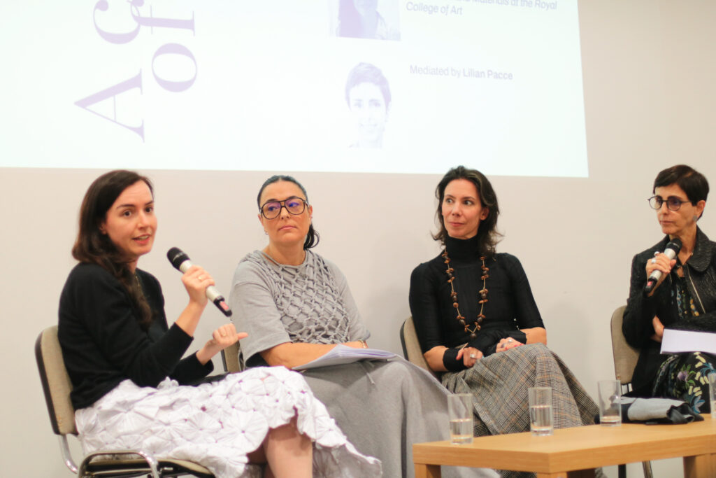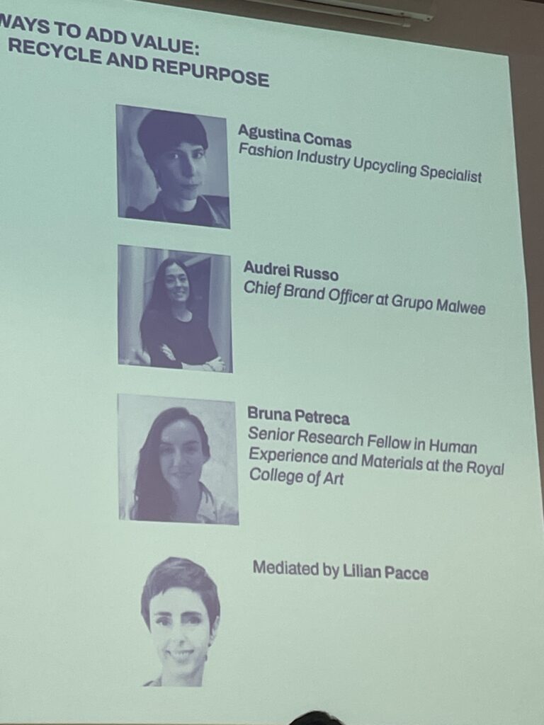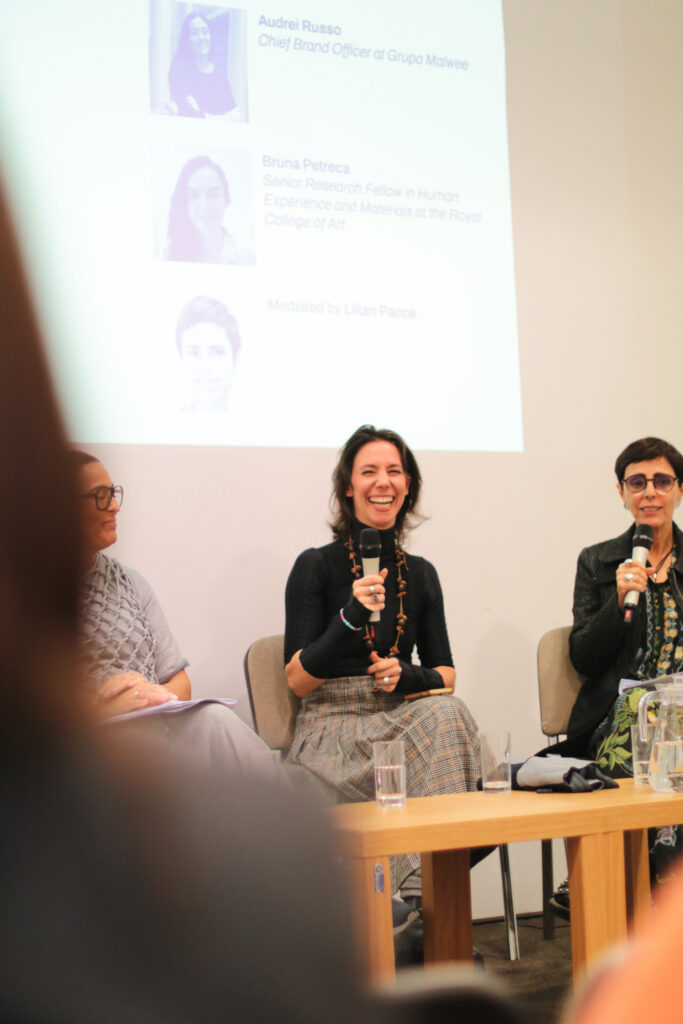 No dia seguinte à abertura da exposição, ainda na Embaixada Brasileira, Agustina participou do painel “New Ways to Add Value: Recycle and Repurpose” (Novas Formas de Agregar Valor: Reciclar e Reutilizar), com Audrei Russo, CBO do Grupo Malwee, e com a pesquisadora da Royal College of Art, Bruna Petreca. Na conversa, mediada pela curadora do evento e jornalista Lilian Pacce, conhecemos algumas ferramentas de circularidade na moda, com a apresentação de diferentes soluções e inovações, como ORICLA ELÁSTICO.