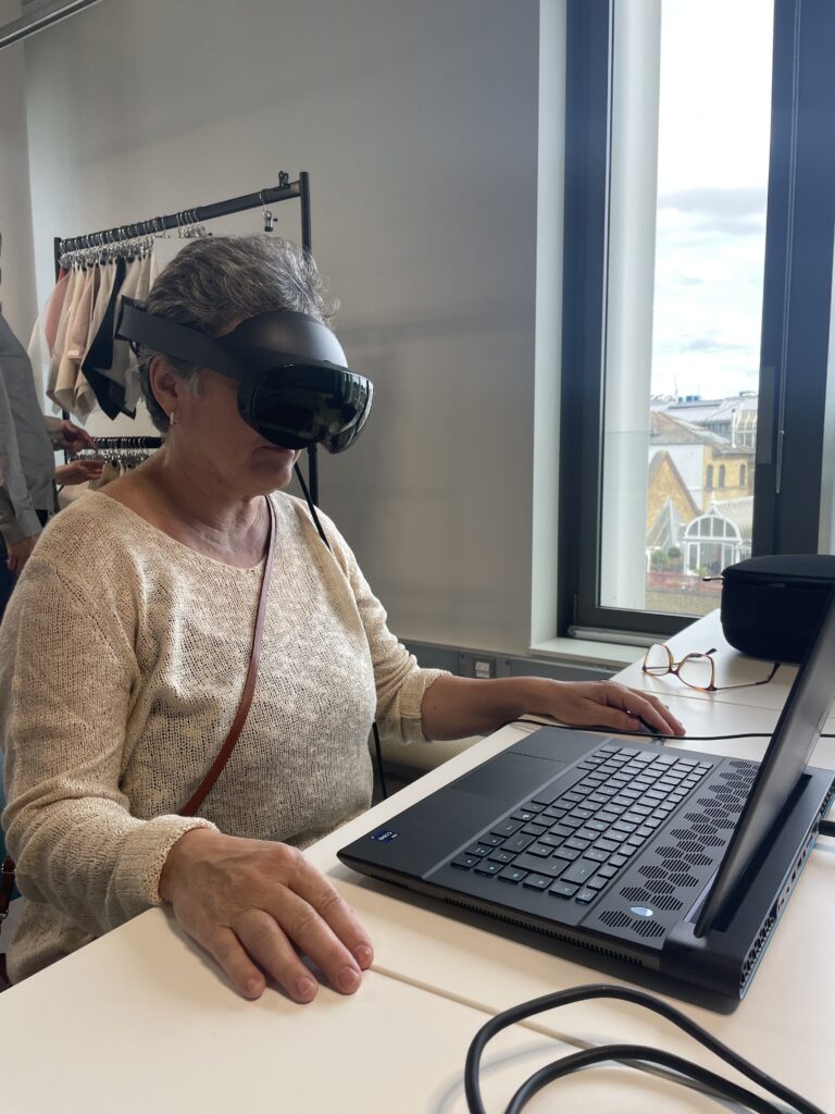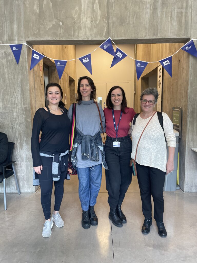 Nas fotos acima: Luanna Cicolo, Agustina Comas, Bruna Petreca e Claudia Cicolo na entrada do prédio da Royal College of Art e Claudia experimentando a realidade aumentada de uma loja de tecidos, ferramenta para descoberta de novas oportunidades para melhorar a experiência virtual na moda.